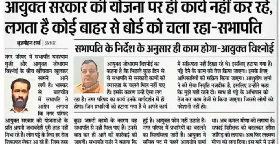 अलवर न्यूज डेस्क, नगर परिषद अध्यक्ष घनश्याम गुर्जर व आयुक्त जेधाराम विश्नई के बीच चल रहा विवाद बुधवार को सुलझता नजर आया। बुधवार को पदभार ग्रहण करने के बाद पहली बार आयुक्त ने अध्यक्ष गुर्जर के साथ अधिकारियों व कर्मचारियों की समीक्षा बैठक ली.