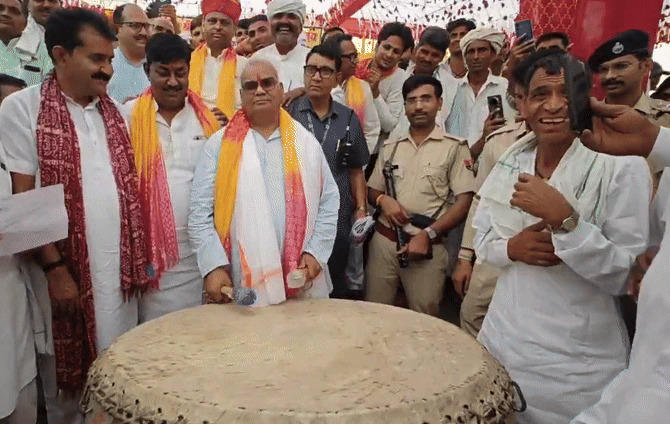 राजस्थान के शिक्षा मंत्री मंडन दिलावर अक्सर गंभीर मुद्दों पर बात करते नजर आते हैं। हाल ही में उनका अनोखा अंदाज सोशल मीडिया पर वायरल हो रहा है। दरअसल, मंत्री एक सरकारी संस्कृत महाविद्यालय के नए भवन के भूमिपूजन समारोह में शामिल हुए थे, जहां भूमिपूजन समारोह के दौरान दंगल गायन का कार्यक्रम चल रहा था। जहां उन्होंने अचानक नौबत (जिसे ढोल नगाड़ा भी कहा जाता है) उठा ली और उसे बजाना शुरू कर दिया। पूरे जोश और दिल से ढोल बजाने का उनका यह वीडियो लोगों को काफी पसंद आ रहा है।