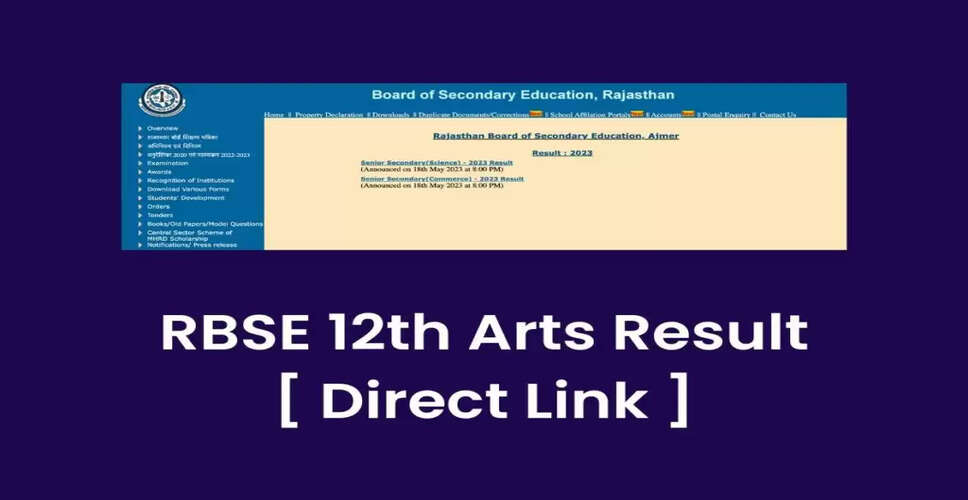 राजस्थान बोर्ड, बीएसईआर अजमेर द्वारा आज, 25 मई 2023 को आरबीएसई 12वीं आर्ट्स रिजल्ट 2023 की घोषणा कर दी गई है। आरबीएसई द्वारा जारी अधिसूचना के मुताबिक राजस्थान बोर्ड 12वीं आर्ट्स रिजल्ट 2023 को गुरूवार दोपहर 3.15 बजे घोषित किया गया। औपचारिक एलान के बाद परिणाम लिंक को ऑफिशियल वेबसाइट rajeduboard.rajasthan.gov.in पर एक्टिव कर दिया गया है। साथ ही, स्टूडेंट्स अपना परिणाम राजस्थान के आधिकारिक रिजल्ट पोर्ट्ल, rajresults.nic.in पर भी देख सकते हैं।