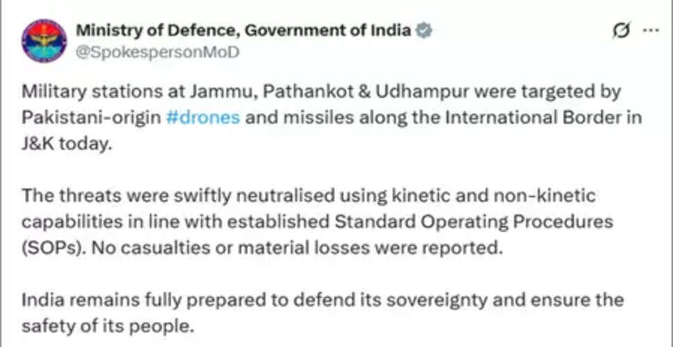 रक्षा मंत्रालय ने आधिकारिक बयान में बताया कि जम्मू, पठानकोट और उधमपुर स्थित सैन्य ठिकानों को पाकिस्तानी ड्रोन और मिसाइलों द्वारा निशाना बनाने की कोशिश की गई। ये हमले जम्मू-कश्मीर में अंतरराष्ट्रीय सीमा के पास किए गए।