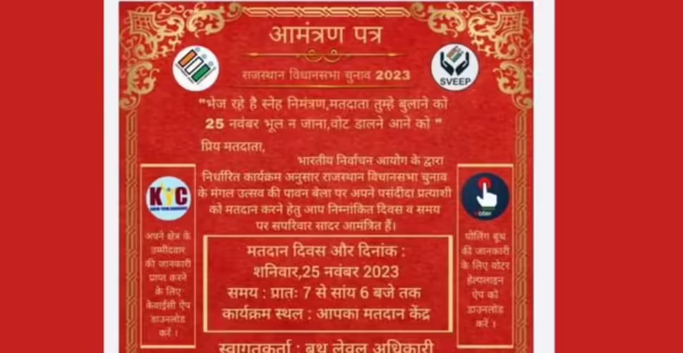 23 नवंबर को देवउठनी एकादशी होने के कारण विवाह समारोह की धूम है. इस दिन जिले में 500 से अधिक शादियां होनी हैं। ऐसे में शादी के माहौल के मुताबिक चुनाव आयोग के अधिकारियों ने शादी के निमंत्रण कार्ड बांटकर एक नवाचार किया है. निमंत्रण पत्र में मतदाता को भारत निर्वाचन आयोग द्वारा निर्धारित कार्यक्रम के अनुसार राजस्थान विधानसभा चुनाव 2023 के महापर्व पर अपने पसंदीदा उम्मीदवार को वोट देने के लिए आमंत्रित किया गया है। चुनाव कर्मियों द्वारा मतदाताओं को भेजे जा रहे निमंत्रण पत्र में चौपाई लिखी हुई है - स्नेह भरा निमंत्रण भेज रहा हूं, मतदाता तुम्हें बुलाएं, 25 नवंबर को मत भूलना, वोट डालने आना। ऐसी अपील की जा रही है. खास बात यह है कि इसका रंग पीला रखा गया है जो हल्दी का रंग है और शगुन का प्रतीक भी है। विवाह और अन्य मांगलिक कार्यों में यह रंग शुभ माना जाता है। मतदाता यह निमंत्रण कार्ड दोस्तों और रिश्तेदारों को भेज रहे हैं। इसके लिए सोशल मीडिया पर जोर-शोर से प्रचार-प्रसार किया जा रहा है.